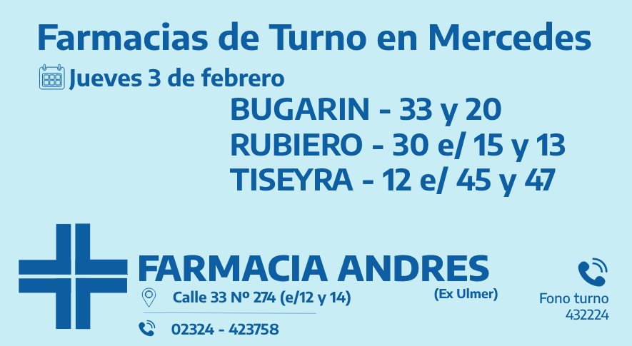Desde las 8:30 del día de hoy hasta la misma hora de mañana, las farmacias de turno en Mercedes son: Bugarín, Rubiero y Tiseyra.