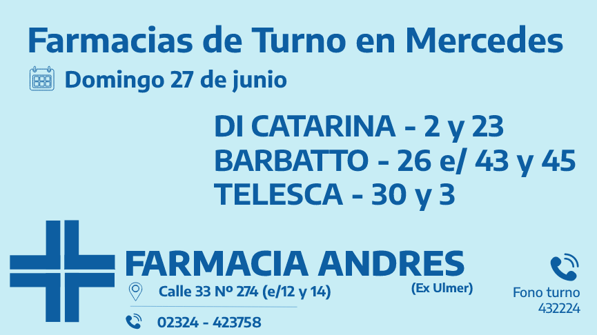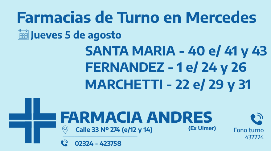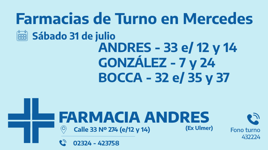 Desde las 8:30 del día de hoy hasta la misma hora de mañana las farmacias de turno en Mercedes son: Andrés, González y Bocca.