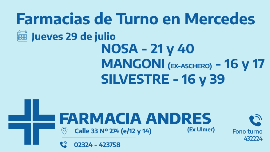 Desde las 8:30 del día de hoy, hasta la misma hora de mañana, las farmacias de turno en Mercedes son: Nosa, Mangoni y Silvestre
