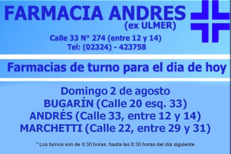 Desde las 8:30 del día de hoy hasta la misma hora de mañana, las farmacias de turno son: Bugarín, Andrés y Marchetti