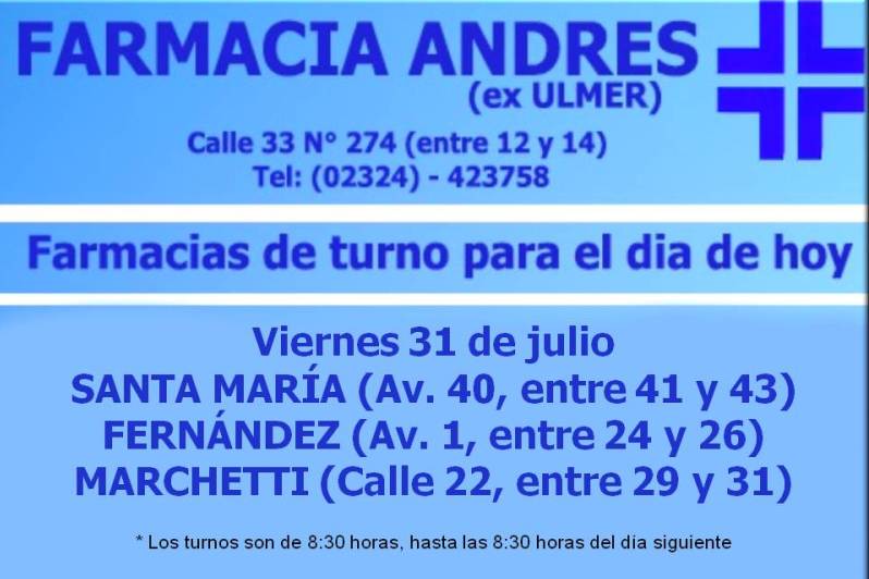 Desde las 8:30 del día de hoy hasta la misma hora de mañana, las farmacias de turno son: Bocca, González y Andrés.