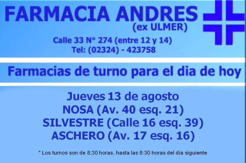 Desde las 8:30 del día de hoy hasta la misma hora de mañana, las farmacias de turno son: Nosa, Silvestre y Aschero