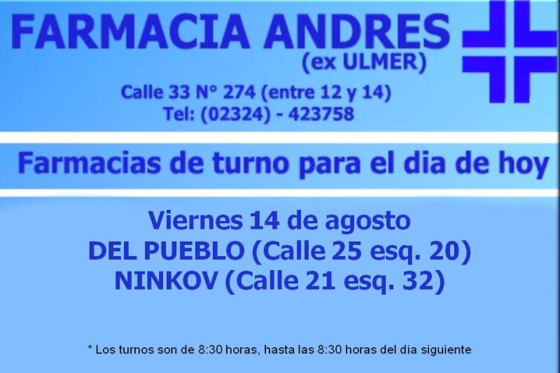 Desde las 8:30 del día de hoy hasta la misma hora de mañana, las farmacias de turno son: Del Pueblo y Ninkov