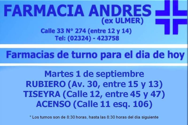 Desde las 8:30 del día de hoy hasta la misma hora de mañana, las farmacias de turno son: Rubiero, Tiseyra y Acenso.