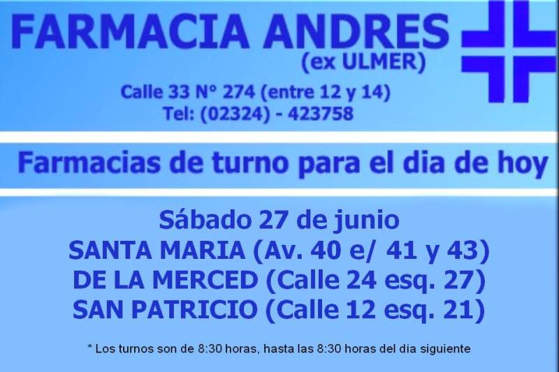 Las farmacias de turno desde la hora 8:30 del día de hoy hasta la misma hora de mañana, son: Nosa, Silvestre y Aschero