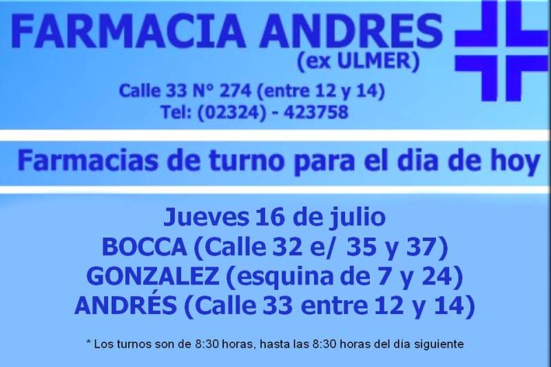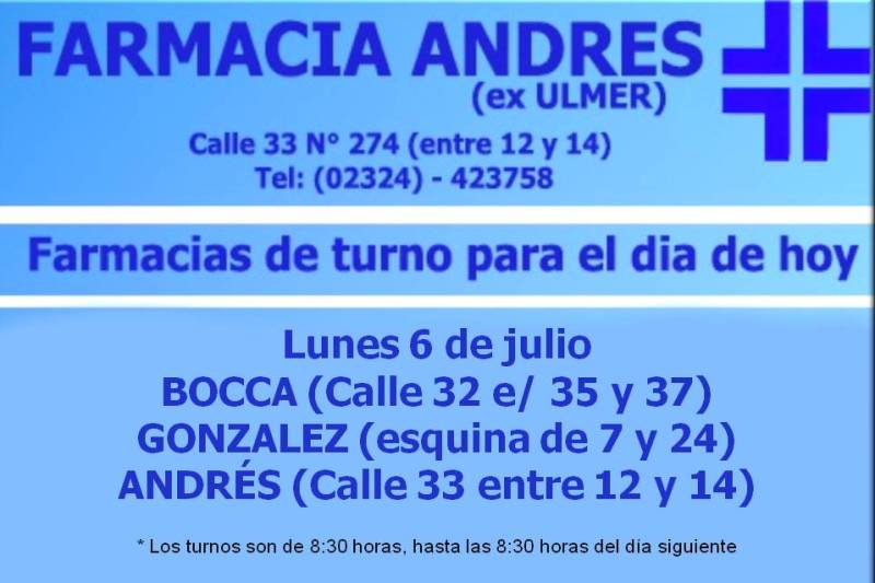 Las farmacias de turno desde las 8:30 del día de hoy hasta la misma hora de mañana, son: Bocca, González y Andrés